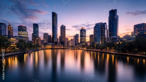 © Akash, Fototapeta premium urban skyline at dusk with illuminated skyscrapers and river reflection