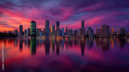 © Svitlana, Fototapeta premium Urban skyline at dusk with skyscraper lights reflected in river water