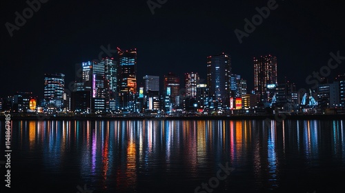 © Afsana, Fototapeta premium Urban skyline at night with glowing billboards, skyscrapers, and colorful water reflections