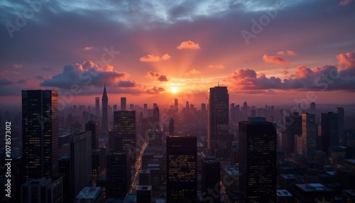 Fototapeta premium Urban skyline at sunset with dramatic orange clouds.Bright, warm, urban sunset through skyscrapers, tall buildings. Overcast, clear weather. Sunlight through the clouds.