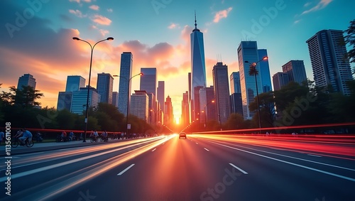 © goodskin, Fototapeta premium Urban skyline at sunset with light trails on a busy street.