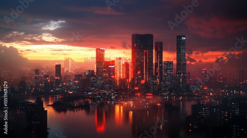 © Panupan, Fototapeta premium Urban Skyline at Sunset with Red Sky and Water Reflection