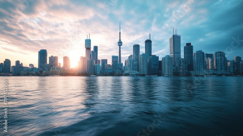 Fototapeta premium Urban skyline at sunset with reflection on water and space for text overlay....