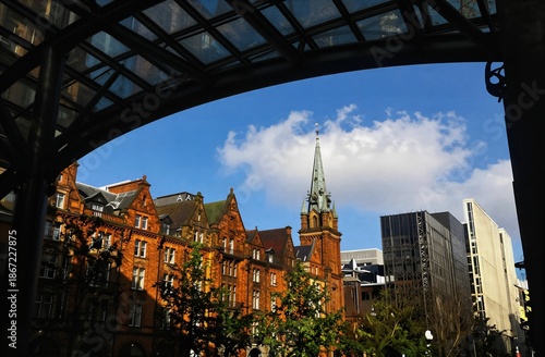 © utaem2022, Fototapeta premium Urban skyline contrasting old new architecture under blue sky