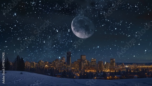© Elzerl, Naklejka premium Urban skyline during twilight under a star-studded sky.