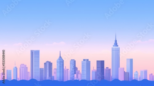 © JK_kyoto, Naklejka premium Urban skyline illustration featuring iconic landmarks and a vibrant sunset sky in pastel colors for artistic and modern design