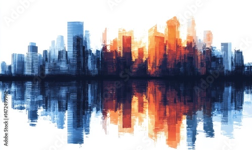 Fototapeta premium Urban skyline reflected in water, abstract impressionistic cityscape
