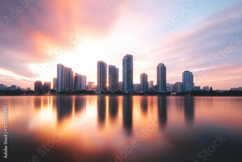 © Riya, Fototapeta premium urban skyline reflected on calm water at sunset