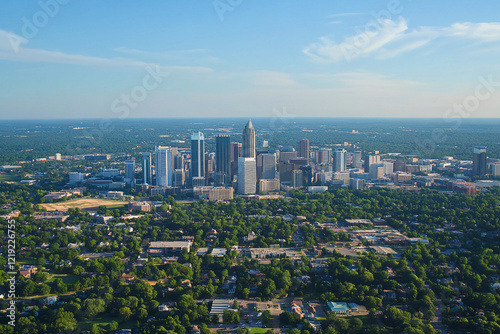 © Kateryna, Fototapeta premium Urban skyline reflecting in calm water during late afternoon with clouds in the sky