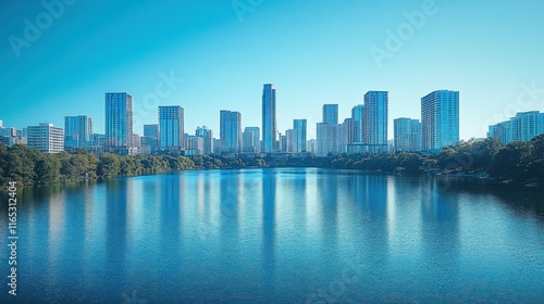 © novitasary, Obraz premium Urban skyline reflecting on a tranquil lake.