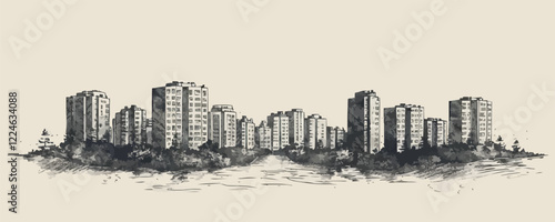 © Viacheslav, Fototapeta premium Urban skyline vector art with monochrome skyscrapers in cityscape.