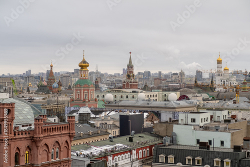 © Anat art, Fototapeta premium Urban Skyline View of Historic Buildings in Moscow With Colorful Domes and Modern Cityscape Under Overcast Sky