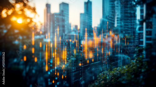 Obraz premium Urban Skyline With Digital Data Visualization at Sunset