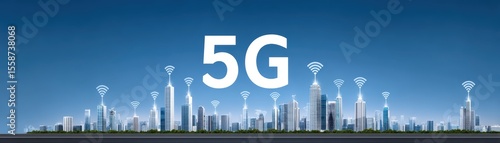 Fototapeta premium Urban Skyline with 5G Technology and Communication Signals Illustrated for...