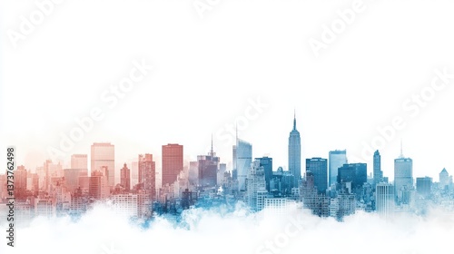© Chaaim, Naklejka premium Urban Skyline with Misty Clouds and Soft Color Palette at Dusk