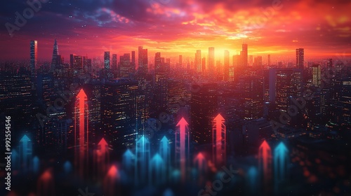 Fototapeta premium Urban Skyline with Red and Blue Upward Arrows at Sunset