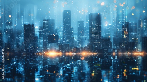 © kitidach, Obraz premium Urban skyscrapers collapsing with dim lights close up, focus on, copy space Dramatic cityscape tones Double exposure silhouette with shadows