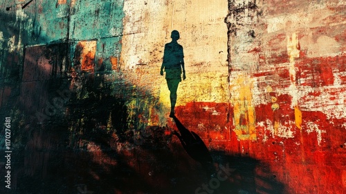 Obraz premium Urban Solitude: Ominous Shadow of a Lone Walker in Gritty Alley Cityscape