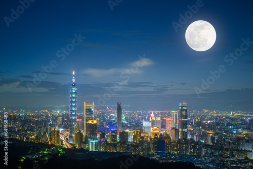 © twabian, Fototapeta premium Urban Splendor at Night: Watching Dynamic Clouds Above a Dazzling Cityscape. View of Taipei city from the Four Beasts Mountain Trail, Taiwan