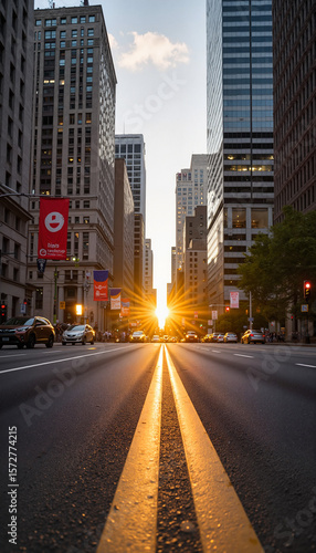 Obraz premium Urban street at sunset with sunlight shining between buildings