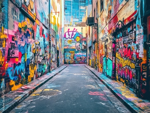 © Zia, Fototapeta premium Urban streets filled with graffiti-covered buildings and paint signs. The colorful street art creates an urban, edgy feel, with vibrant designs and messages scattered across the walls
