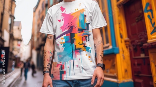 Obraz premium Urban streetwear t-shirt with graffiti elements and negative space --ar 16:9 --stylize 250 Job ID: e093df9b-46e4-49ca-bb96-1ccc0bb19d61
