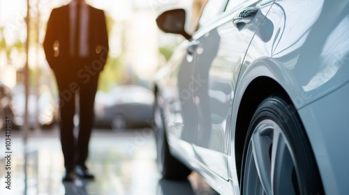 Fototapeta premium Urban style, man walks past a sleek car on city street
