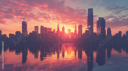 Fototapeta premium Urban Sunset Cityscape with Vibrant Skyline Reflections and Serene Nightfall...