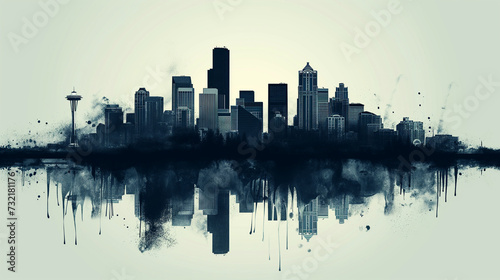 Obraz premium Urban Sunset Reflection: Silhouetted City Skyline with Skyscrapers,...
