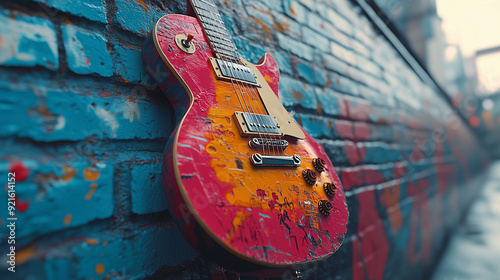 Naklejka premium Urban Symphony: A vibrant, paint-splattered electric guitar leans against a colorful brick wall, embodying the raw energy and rebellious spirit of rock music.