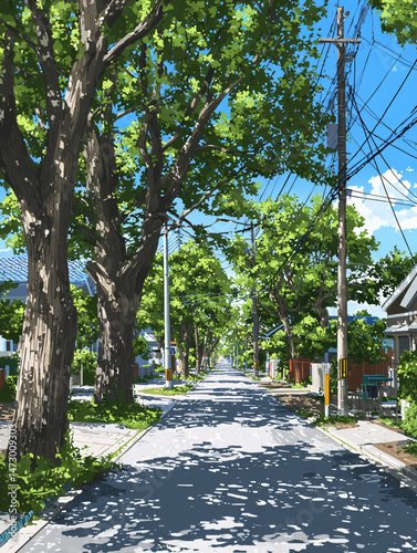 © NNS Studio Clipart, Fototapeta premium Urban Tranquility Summer Street Scene: Residential Neighborhood Pathway with Trees, Shadows, Sunlight, Blue Sky, Greenery, Vivid Foliage, Houses, Scenic Views, Idyllic Landscape, Outdoor Perspective