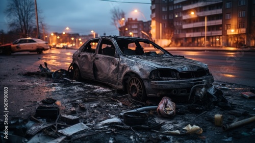 Fototapeta premium Urban twilight collision damaged vehicle, debris, blurred city traffic in background
