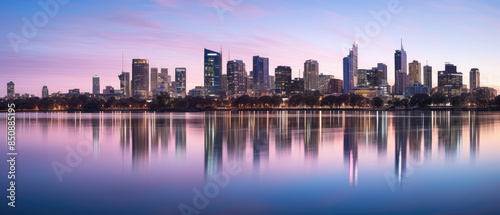 Fototapeta premium Urban Twilight: Reflective City Skyline at Dusk