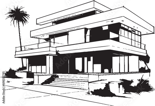 © BABBAN, Naklejka premium Urban Villa Sketch Sleek City House in Crisp Black Cityline Mansion Silhouette Villa Vector Outline in Bold Black