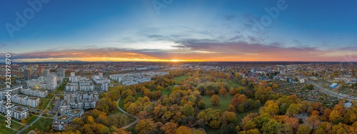 © allessuper_1979, Fototapeta premium Urbanes Panorama eines Sonneruntergangs über der bayrischen Landeshauptstadt München im bunt beblätterten Hirschgarten, ein Park mit angrenzenden Wohnhäusern als Luftbild einer Drohne im Herbst