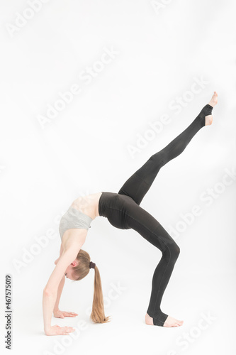 Naklejka premium Urdhva Dhanurasana. Upward Bow Wheel Pose. Girl is engaged in gymnastics on white background. Yoga practice. Performing asanas.