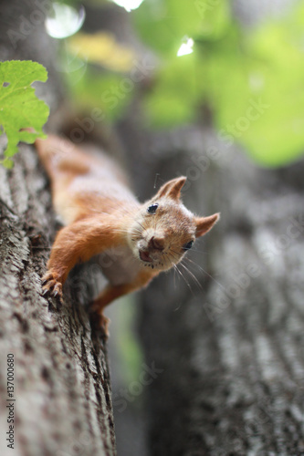 Fototapeta premium Сurious squirrel on the tree in summer day.