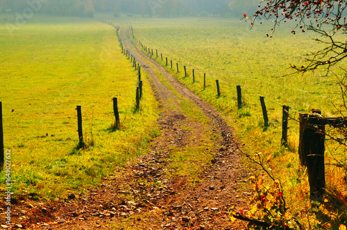 © Pol Badger, Naklejka premium Urocza, gruntowa ścieżka otoczona drewnianymi płotami wije się przez bujną, zieloną okolicę w ciepłym słońcu, podkreślając rustykalne piękno i spokojną, wiejską naturę.