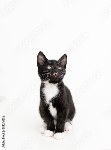 Obraz premium Urocza kotka młody smoking czarno-biały na białym tle