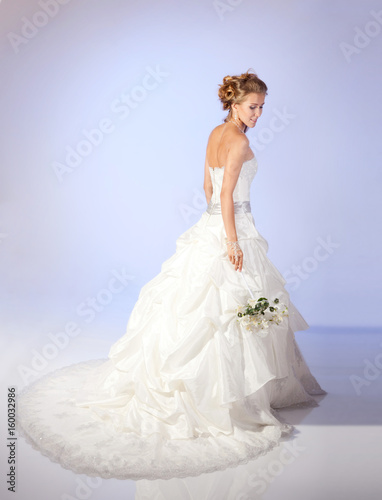 © AlexanderNovikov, Fototapeta premium Urocza panna młoda z bukietem kwiatów na jasnym tle. Pozytywne emocje.