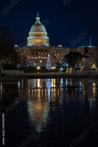Fototapeta premium US Capitol and Capitol Christmas Tree with Icy Reflection