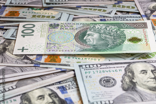 Fototapeta premium 100 US dollar and 100 polish zloty banknotes