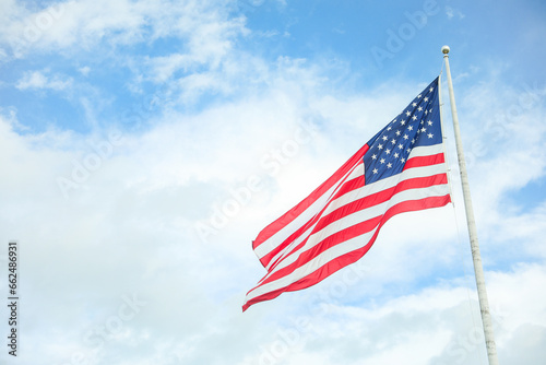 Fototapeta premium US flag waving in the wind against a blue sky. Symbol of freedom, unity, and national pride. Perfect for patriotic themes