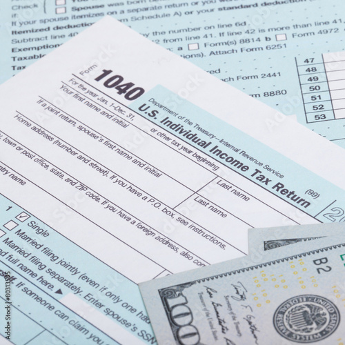 © niyazz, Fototapeta premium US Tax Form and dollars - studio shot