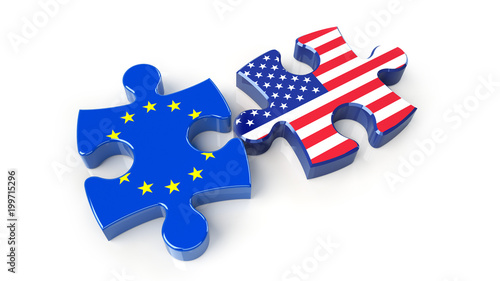 © klenger, Naklejka premium USA and EU flags on puzzle pieces. Political relationship concept