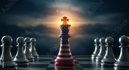 © Meiza, Fototapeta premium USA Chess King Stands Strong in a Strategic Power Game