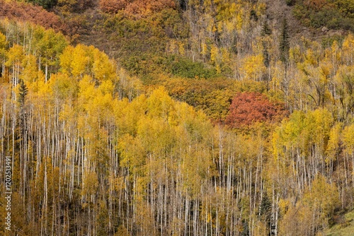 Fototapeta premium USA, Colorado, Uncompahgre National Forest. Aspens on mountainside in autumn.