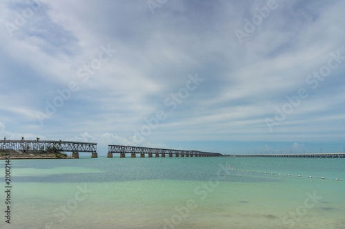 Fototapeta premium USA, Florida, Ancient overseas railway bridge in bahia honda state park from beach