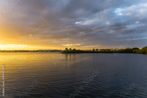 Fototapeta premium USA, Florida, Orange glowing sky with some clouds and highway bridge behind reflecting water