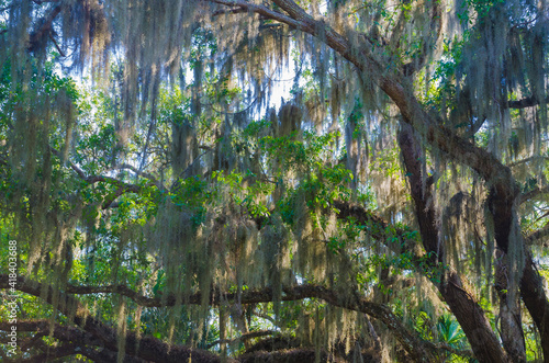 Fototapeta premium USA, Florida. Tropical garden with palm trees and living oak covered in...